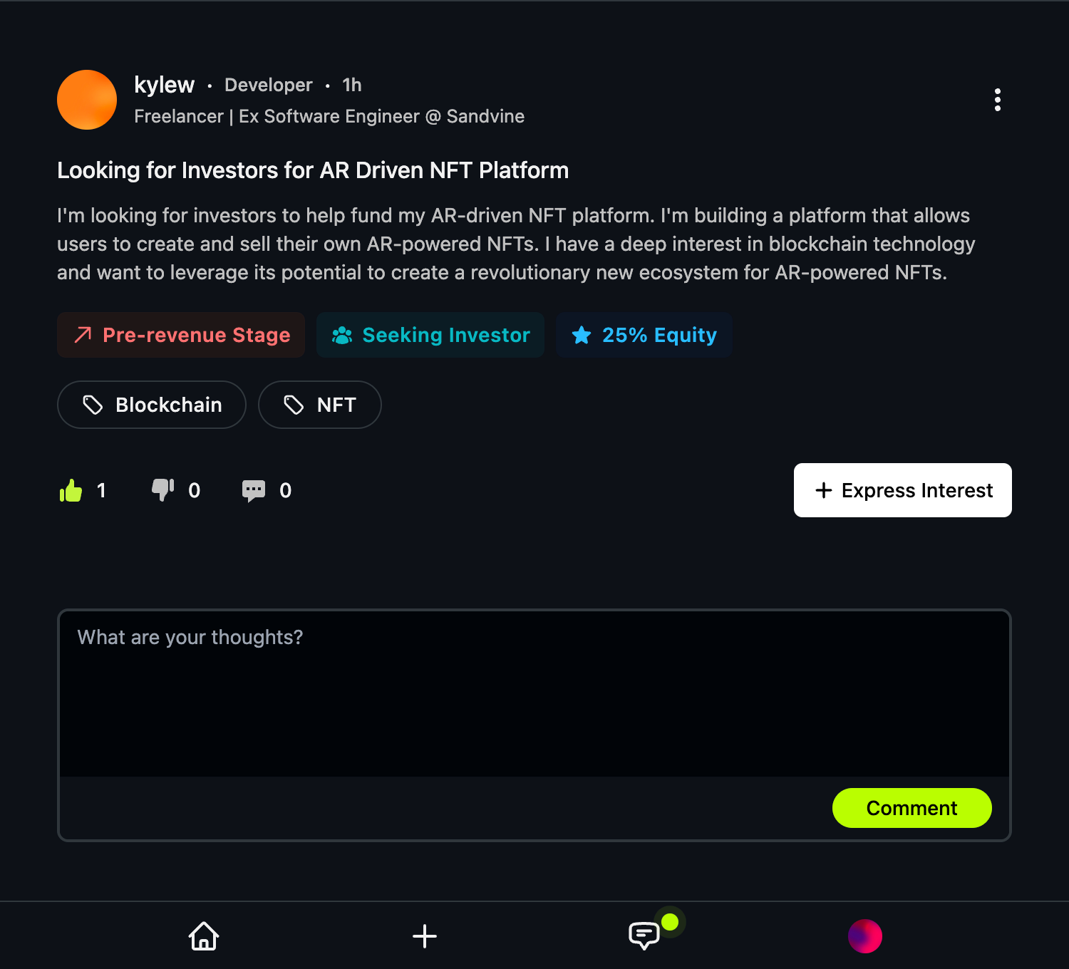 - Pitch your idea to vetted community of developers & tech sales wizards and offer equity in exchange. No more freelancers.